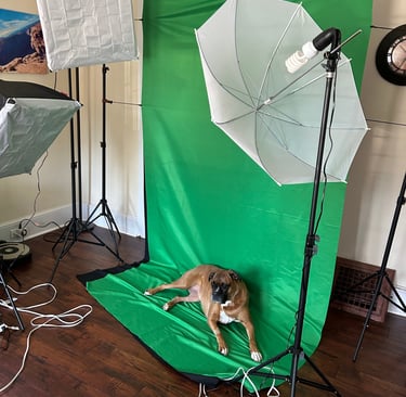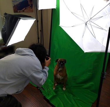Last week, I was petsitting my sister's dog, Gia. She is a full bred Boxer. She watched as I was setting up my studio equipment for a photo shoot. When I was finished, she trotted over and sat down right in front of the green screen, waiting like a little Diva Model. I grabbed my camera and started shooting Gia's very first pet photo shoot in a studio. She loved it! I wish most Pet Photo Shoots were as easy as Gia's but each comes with its own challenges and rewards. That is why I usually go into each shoot with no expectations and my main goal is to captured the personality of the pet and love that surrounds him/her. Whether its in a studio setting, a park or a home, its usually so much fun and a great experience for all of us, the pet, the owner and me.